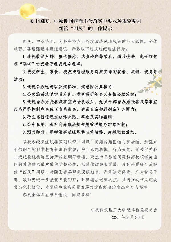 关于国庆、中秋期间锲而不舍落实中央八项规定精神纠治“四风”的工作提示