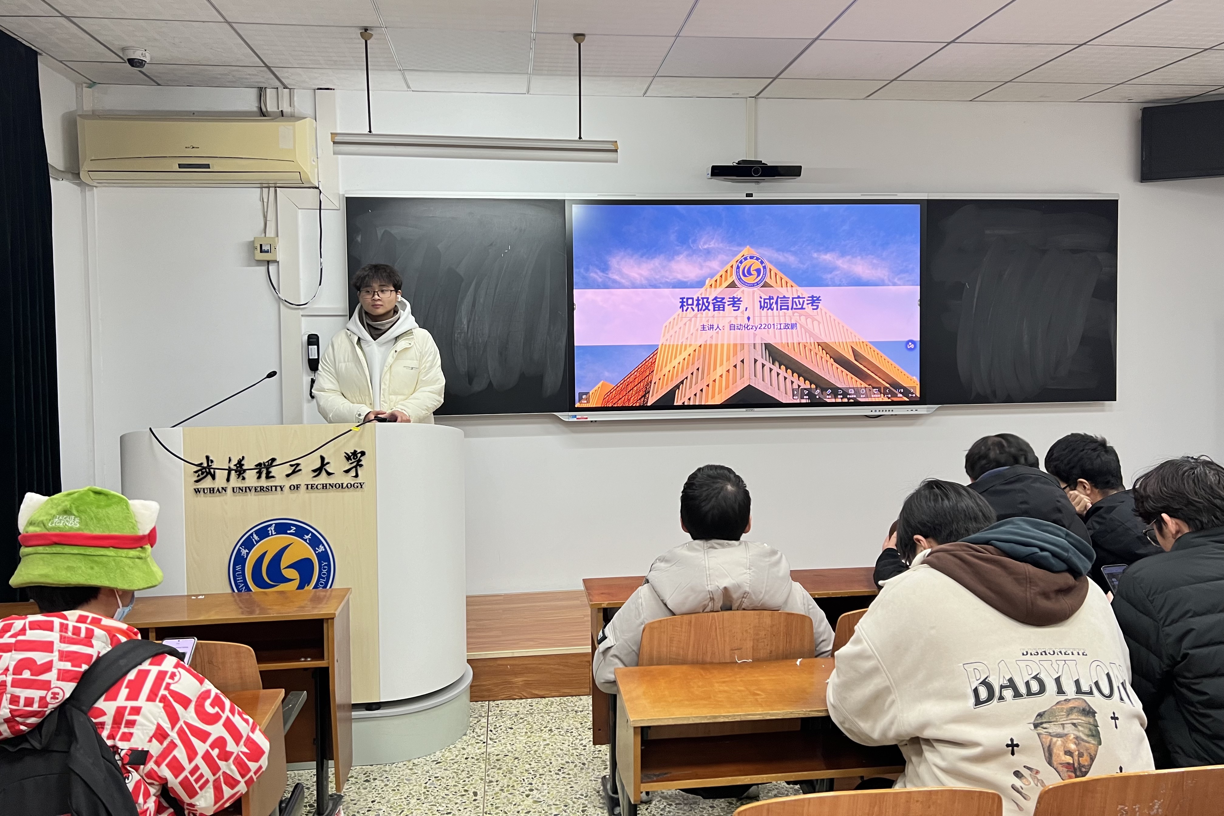 班会最后,江政鹏再次提醒同学们要认真复习,争取取得优异的成绩,为自己的未来打下坚实的基础。至此,自动化zy2201班“积极备考,诚信应考”主题班会圆满结束。